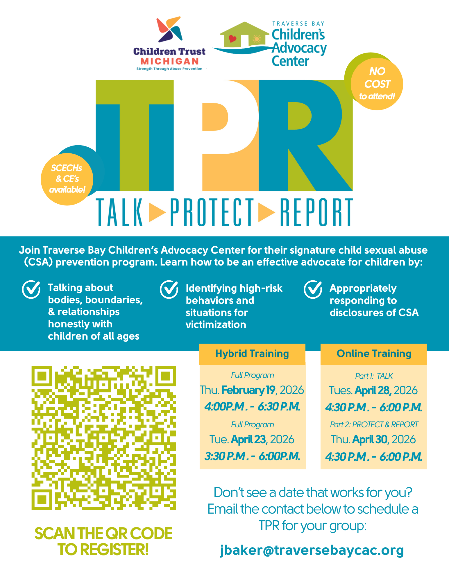 We make it easy to take Talk·Protect·Report™️ training—join us online, have us come to you, or visit our location in Grand Traverse County! However you choose to participate, we’re here to make learning simple and accessible.